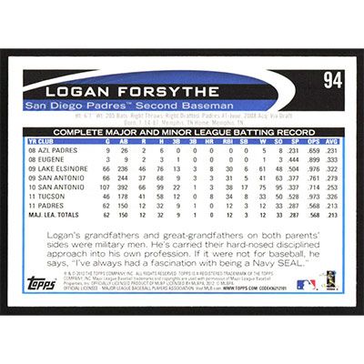 This is a 2012 Topps Logan Forsythe baseball card. The card is #94 and pictures show condition.