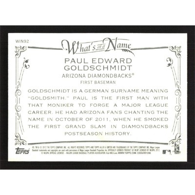 This is a 2012 Topps Allen & Ginter What's in a Name Paul Goldschmidt baseball card. The card is #WIN92 and pictures show condition. Team(s): Arizona Diamondbacks