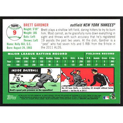 This is a 2012 Topps Archives Brett Gardner baseball card. The card is #9 and pictures show condition.