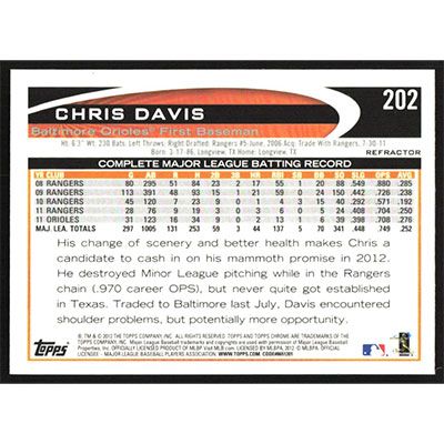 This is a 2012 Topps Chrome Purple Refractors Chris Davis baseball card. The card is #202 and pictures show condition.