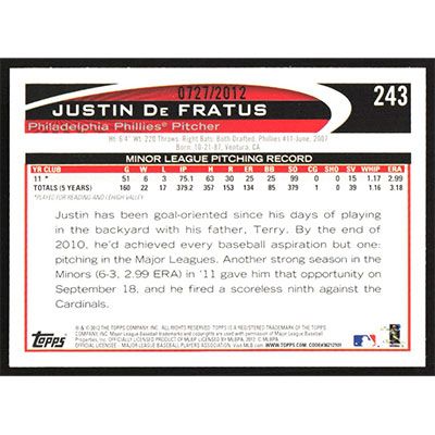 This is a 2012 Topps Gold Justin De Fratus baseball card. The card is #243 and pictures show condition. This card is limited; #'d 0727/2012. Team(s): Philadelphia Phillies Rookie Card (RC)
