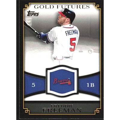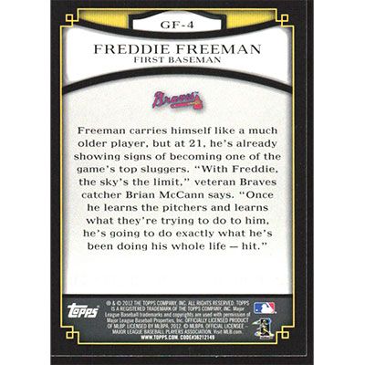 This is a 2012 Topps Gold Futures Freddie Freeman baseball card. The card is #GF-4 and pictures show condition.