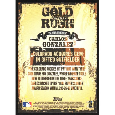 This is a 2012 Topps Gold Rush Wrapper Redemption Carlos Gonzalez baseball card. The card is #11 and pictures show condition.