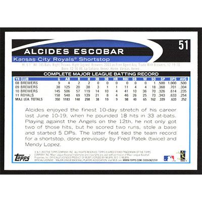This is a 2012 Topps Gold Sparkle Alcides Escobar baseball card. The card is #51 and pictures show condition.