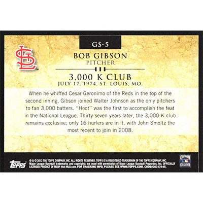 This is a 2012 Topps Gold Standard Bob Gibson baseball card. The card is #GS-5 and pictures show condition.