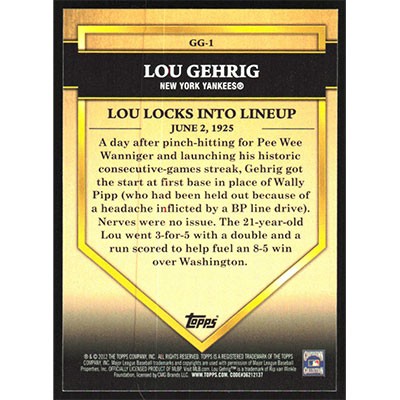 This is a 2012 Topps Golden Greats Lou Gehrig baseball card. The card is #GG-1 and pictures show condition.