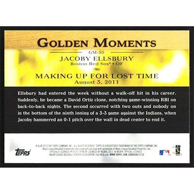 This is a 2012 Topps Golden Moments Jacoby Ellsbury baseball card. The card is #GM-30 and pictures show condition.