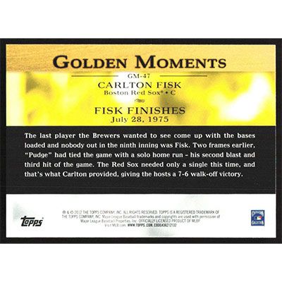 This is a 2012 Topps Golden Moments Carlton Fisk baseball card. The card is #GM-47 and pictures show condition.
