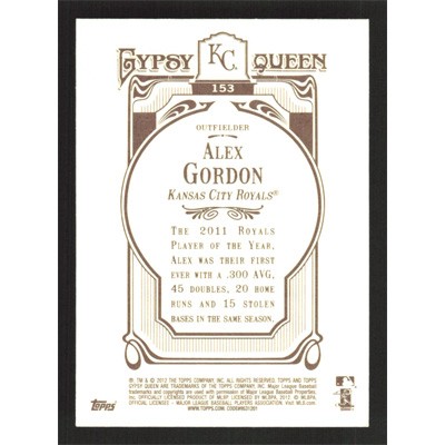 This is a 2012 Topps Gypsy Queen Alex Gordon baseball card. The card is #153 and pictures show condition.