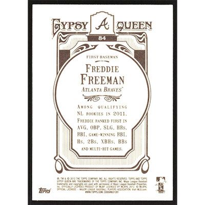 This is a 2012 Topps Gypsy Queen Freddie Freeman baseball card. The card is #84 and pictures show condition.