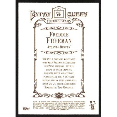 This is a 2012 Topps Gypsy Queen Future Stars Freddie Freeman baseball card. The card is #FS-FF and pictures show condition.