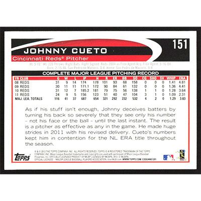 This is a 2012 Topps Opening Day Johnny Cueto baseball card. The card is #151 and pictures show condition.