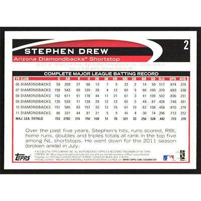 This is a 2012 Topps Opening Day Stephen Drew baseball card. The card is #2 and pictures show condition.