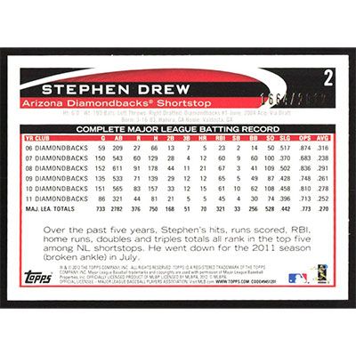 This is a 2012 Topps Opening Day Blue Stephen Drew baseball card. The card is #2 and pictures show condition. This card is limited; #'d 1664/2012. Team(s): Arizona Diamondbacks
