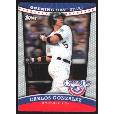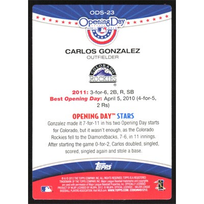 This is a 2012 Topps Opening Day Stars Carlos Gonzalez baseball card. The card is #ODS-23 and pictures show condition.