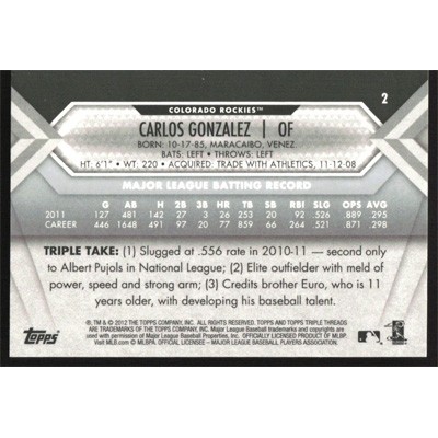 This is a 2012 Topps Triple Threads Carlos Gonzalez baseball card. The card is #2 and pictures show condition.