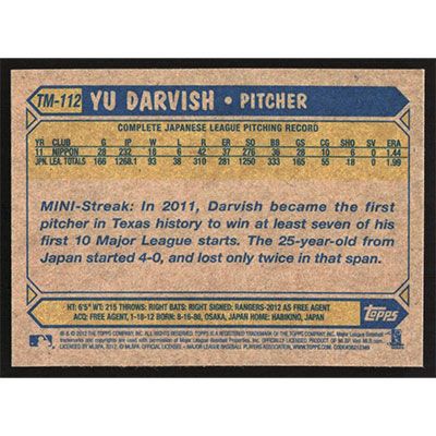 This is a 2012 Topps Update 1987 Minis Yu Darvish Future Stars baseball card. The card is #TM-112 and pictures show condition. Team(s): Texas Rangers Rookie Card (RC)