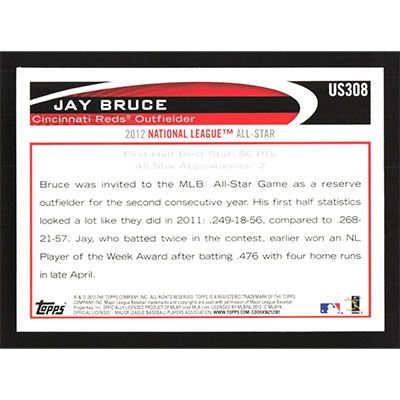 This is a 2012 Topps Update Gold Sparkle Jay Bruce baseball card. The card is #US308 and pictures show condition.