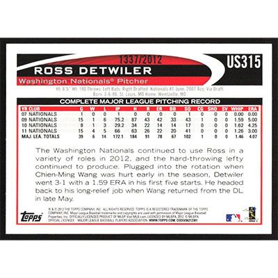 This is a 2012 Topps Update Gold Ross Detwiler baseball card. The card is #US315 and pictures show condition. This card is limited; #'d 1337/2012. Team(s): Washington Nationals