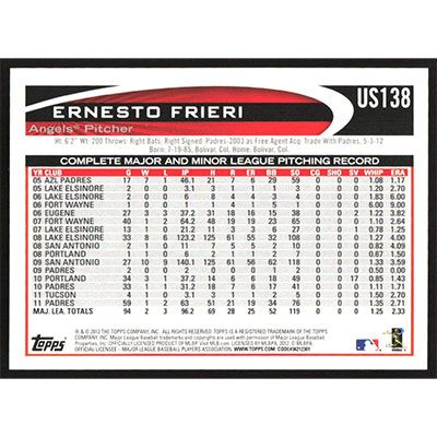 This is a 2012 Topps Update Ernesto Frieri baseball card. The card is #US138 and pictures show condition.