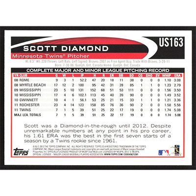 This is a 2012 Topps Update Scott Diamond baseball card. The card is #US163 and pictures show condition.