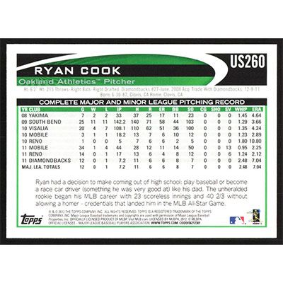 This is a 2012 Topps Update Ryan Cook baseball card. The card is #US260 and pictures show condition.