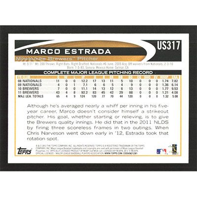 This is a 2012 Topps Update Marco Estrada baseball card. The card is #US317 and pictures show condition.