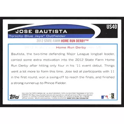 This is a 2012 Topps Update Jose Bautista All-Star baseball card. The card is #US40 and pictures show condition.