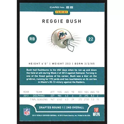 This is a 2012 Totally Certified Reggie Bush football card. The card is #22 and pictures show condition.