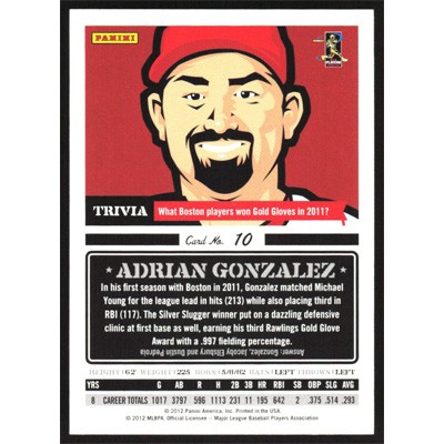 This is a 2012 Triple Play Adrian Gonzalez baseball card. The card is #10 and pictures show condition.
