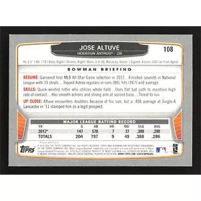 This is a 2013 Bowman Jose Altuve baseball card. The card is #108 and pictures show condition.