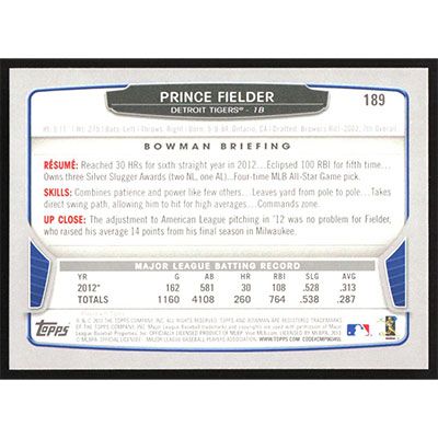 This is a 2013 Bowman Prince Fielder baseball card. The card is #189 and pictures show condition.