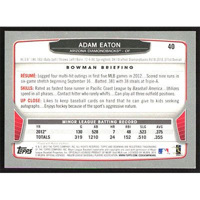 This is a 2013 Bowman Adam Eaton baseball card. The card is #40 and pictures show condition.