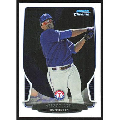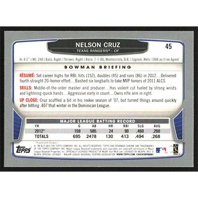 This is a 2013 Bowman Chrome Nelson Cruz baseball card. The card is #45 and pictures show condition.