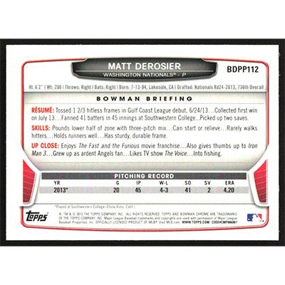 This is a 2013 Bowman Chrome Draft Picks Matt Derosier baseball card. The card is #BDPP112 and pictures show condition.