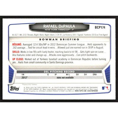 This is a 2013 Bowman Chrome Prospects Rafael DePaula baseball card. The card is #BCP174 and pictures show condition.
