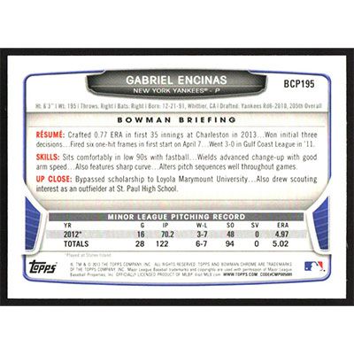 This is a 2013 Bowman Chrome Prospects Gabriel Encinas baseball card. The card is #BCP195 and pictures show condition.