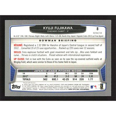 This is a 2013 Bowman Chrome Refractors Kyuji Fujikawa baseball card. The card is #8 and pictures show condition. Team(s): Chicago Cubs Rookie Card (RC)