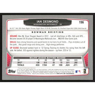 This is a 2013 Bowman Gold Ian Desmond baseball card. The card is #196 and pictures show condition.