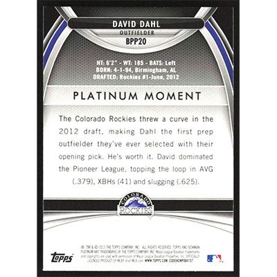This is a 2013 Bowman Platinum Prospects David Dahl baseball card. The card is #BPP20 and pictures show condition.