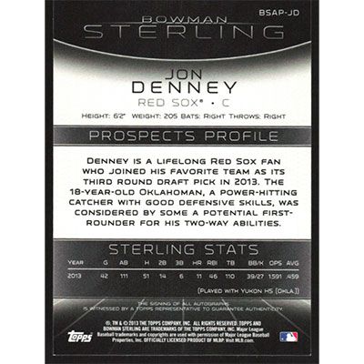 This is a 2013 Bowman Sterling Prospect Autographs Jon Denney autographed baseball card. This card has been signed, in blue, by Jon Denney, and is certified authentic by Topps. The card is #BSAP-JD and pictures show condition.