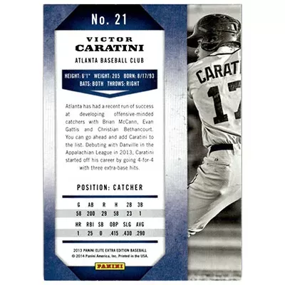 This is a 2013 Elite Extra Edition Victor Caratini autographed baseball card. This card has been signed, in blue, by Victor Caratini, and is guaranteed authentic by Ballcardz.com. The card is #21 and is in NM-MT condition.