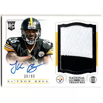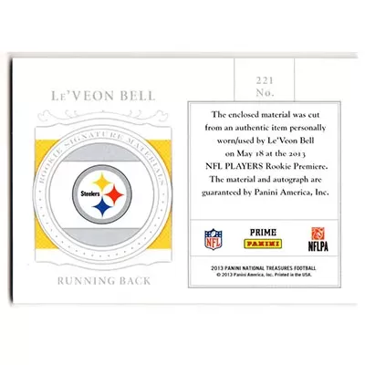 This is a 2013 Panini National Treasures Le'Veon Bell Rookie Patch Autograph football card. The card is #221 . See images for condition.
