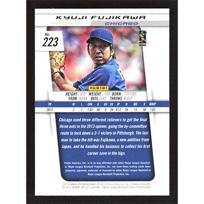 This is a 2013 Panini Prizm Kyuji Fujikawa baseball card. The card is #223 and pictures show condition.