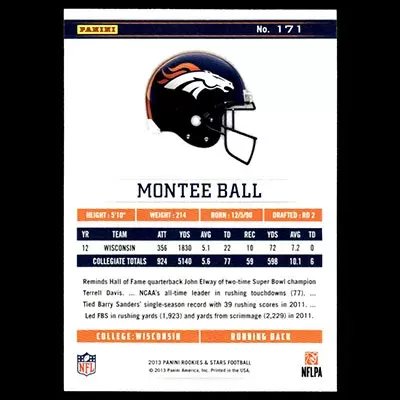 This is a 2013 Panini Rookies & Stars Montee Ball football card. The card is #171 and is in NM-MT condition.