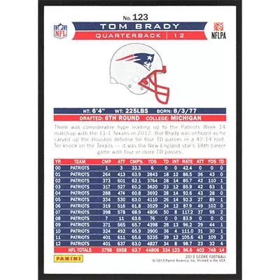 This is a 2013 Score Tom Brady football card. The card is #123 and pictures show condition.