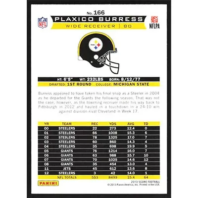 This is a 2013 Score Plaxico Burress football card. The card is #166 and pictures show condition.