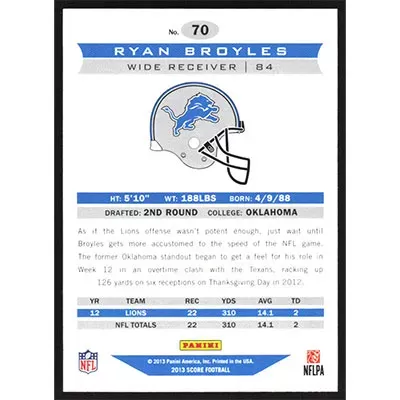 This is a 2013 Score Scorecard Ryan Broyles football card. The card is #70 and pictures show condition.
