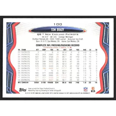 This is a 2013 Topps Tom Brady football card. The card is #100 and pictures show condition.