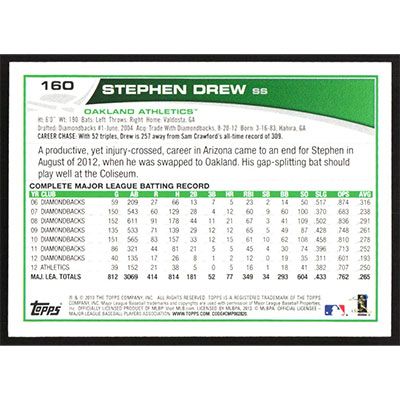 This is a 2013 Topps Stephen Drew autographed baseball card. This card has been signed, in blue, by Stephen Drew, and is guaranteed authentic by Ballcardz.com. The card is #160 and pictures show condition.